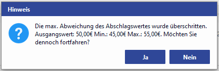 Der zu ändernde Abschlagsbetrag sollte einen Schwellenwert in % nicht über- bzw. unterschreiten. Wenn beim Fortfahren festgestellt wird, dass der eingegebene Abschlagswert über den Schwellenwert hinaus abweicht, erscheint eine Hinweismeldung