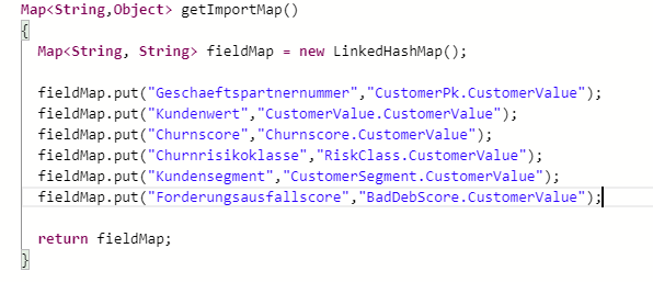 In der Methode getImportMap() kann die neue Spalte mit dem dazugehörigen Feldmapping ergänzt werden. Der Schlüssel beschreibt den neuen Spaltennamen, der dazugekommen ist. Der Wert definiert das Feld auf der Kundenwert-Entität, in dem der Wert aus der Importdatei eingetragen werden soll.Aufnahme des Feldes bei der Ermittlung der Import-Feldwerte