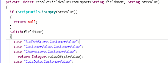 In der Methode resolveFieldValueFromImport() werden die verschiedenen Feldtypen der Kundenwert-Entität behandelt. Hier muss als case das neue Feld aufgenommen werden, welches durch den Import mit befüllt werden soll.