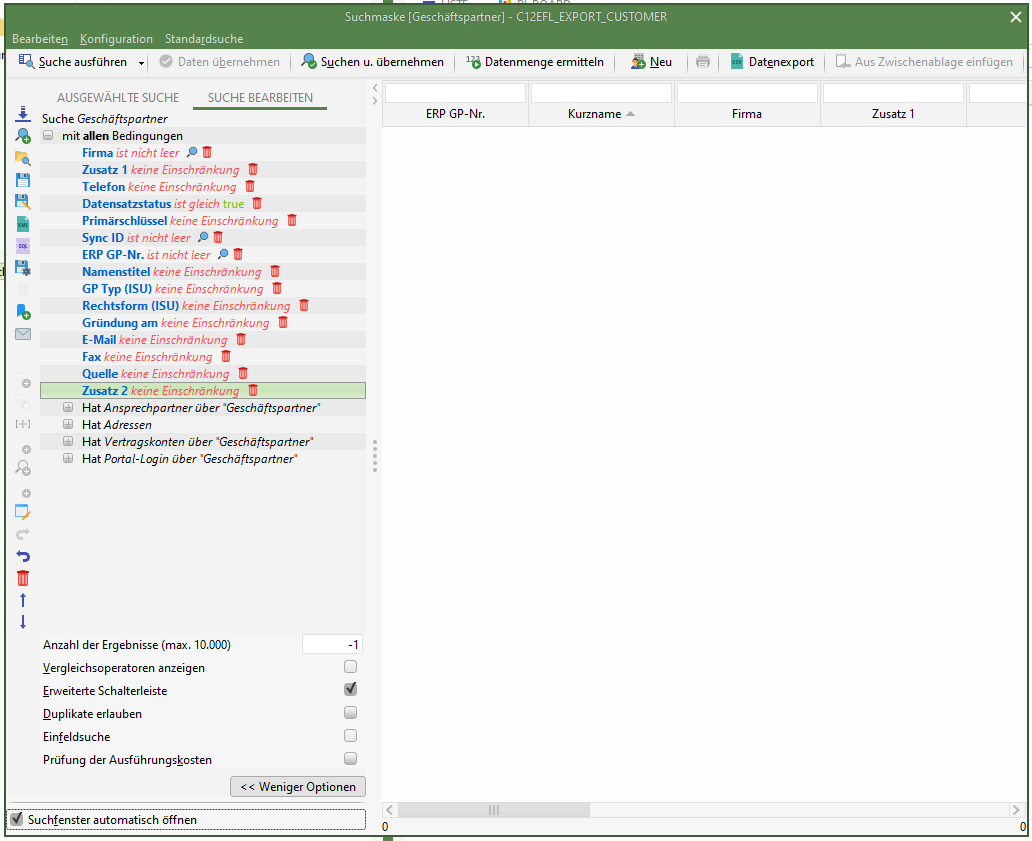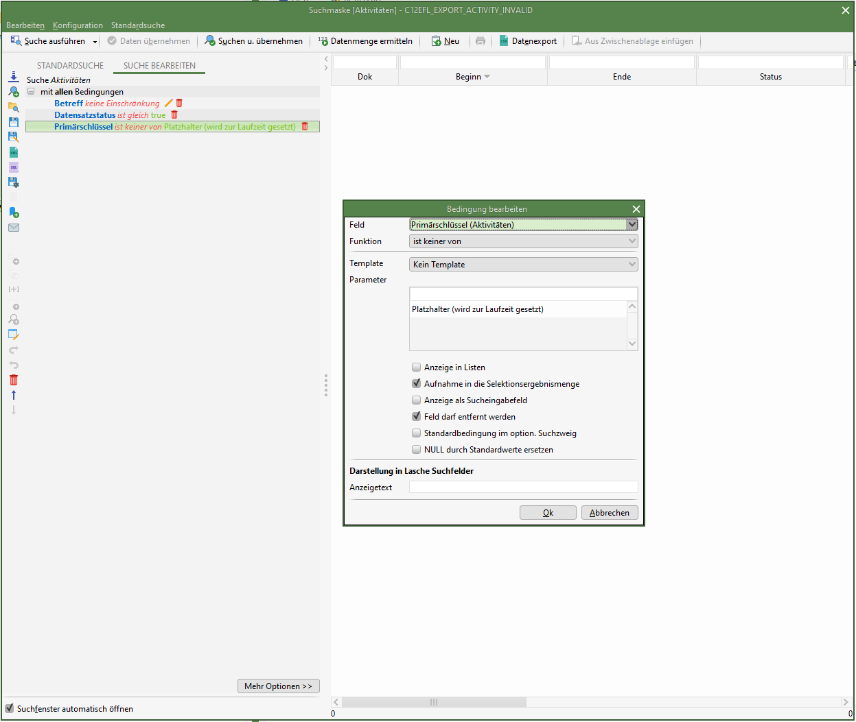- Der Name der Suche muss dem Schema C12EFL_EXPORT_<Hauptentität>_INVALID (z.B. C12EFL_EXPORT_ACTIVITY_INVALID) entsprechen