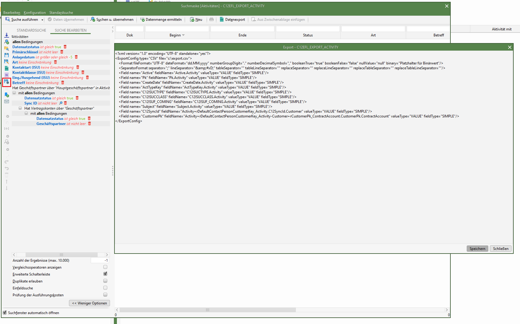 Erstellen einer Suche, welche für den CSV-Export verwendet werden kann. Die Suche muss folgende Kriterien erfüllen:- Der Name der Suche muss dem Schema C12EFL_EXPORT_<Hauptentität> (z.B. C12EFL_EXPORT_ACTIVITY) entsprechen