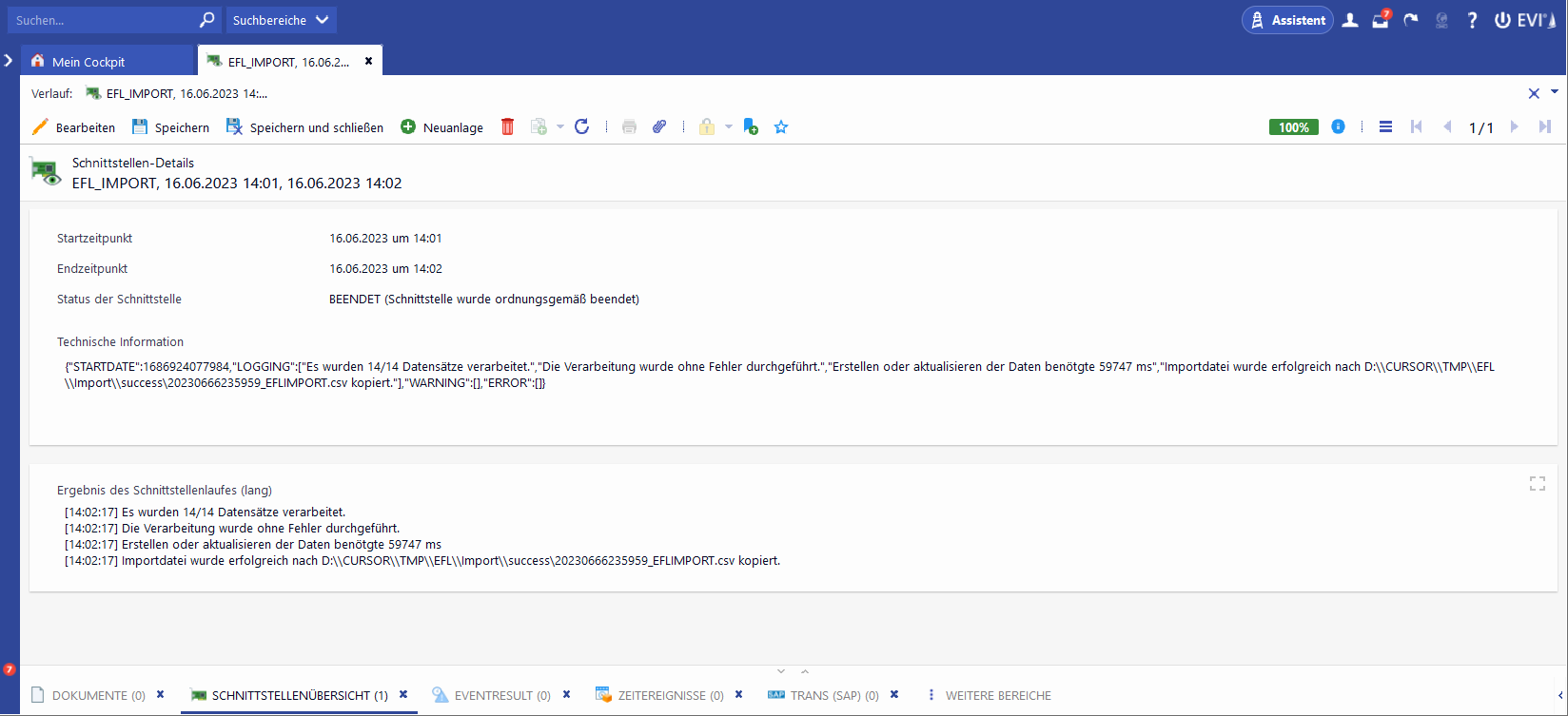 Für jeden Importlauf wird ein Datensatz in der Tabelle Schnittstellen-Details (InterfaceDetail) geschrieben. Alle Schnittstellen-Details sind unter der Schnittstellenübersicht mit dem Schnittstellennamen EFL_IMPORT zusammengefasst.