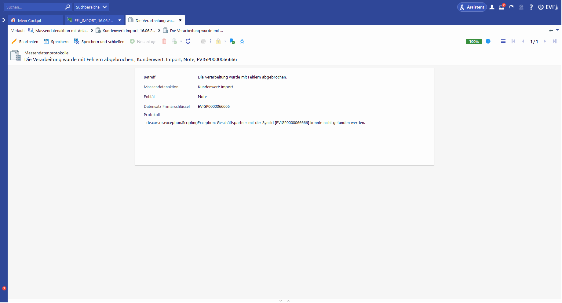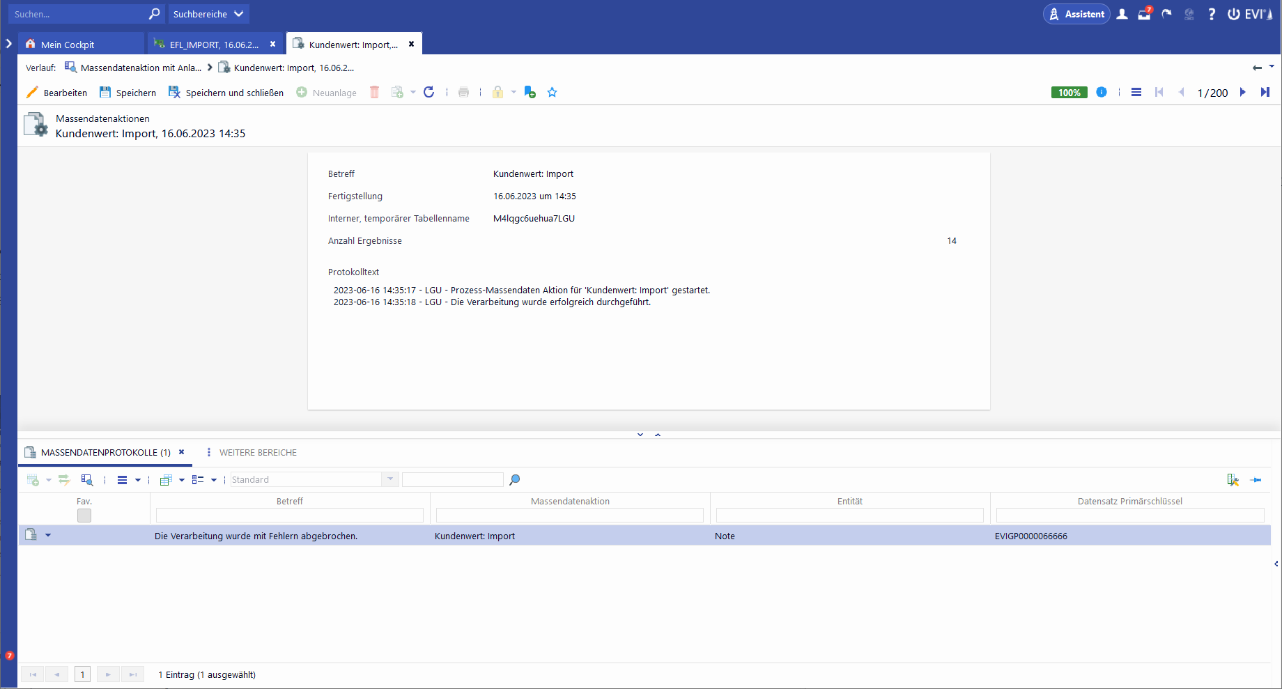 Ist die Globale Variable "C12CVEFLLogErrors" aktiv, erfolgt zusätzlich eine Protokollierung des Importlaufs in der Massendatenaktion, bzw. von im Import aufgetretenen Fehlern im Unterbereich Massendaten-Protokolle.