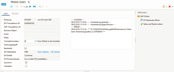 Über den Aktionsbutton "EVI Datensatz öffnen" ist es möglich, den Datensatz zu betreten und sich die Daten anzuschauen, um so den Grund für den Fehler zu finden. Im Datensatz selbst gibt es den Aktionsbutton "Transaktionen", mit dem alle WOI-TRANS-Sätze zu diesem Datensatz eingesehen werden können. Dies ist hilfreich, um die Ergebnisse früherer Übertragungen zu sehen und zu bewerten.