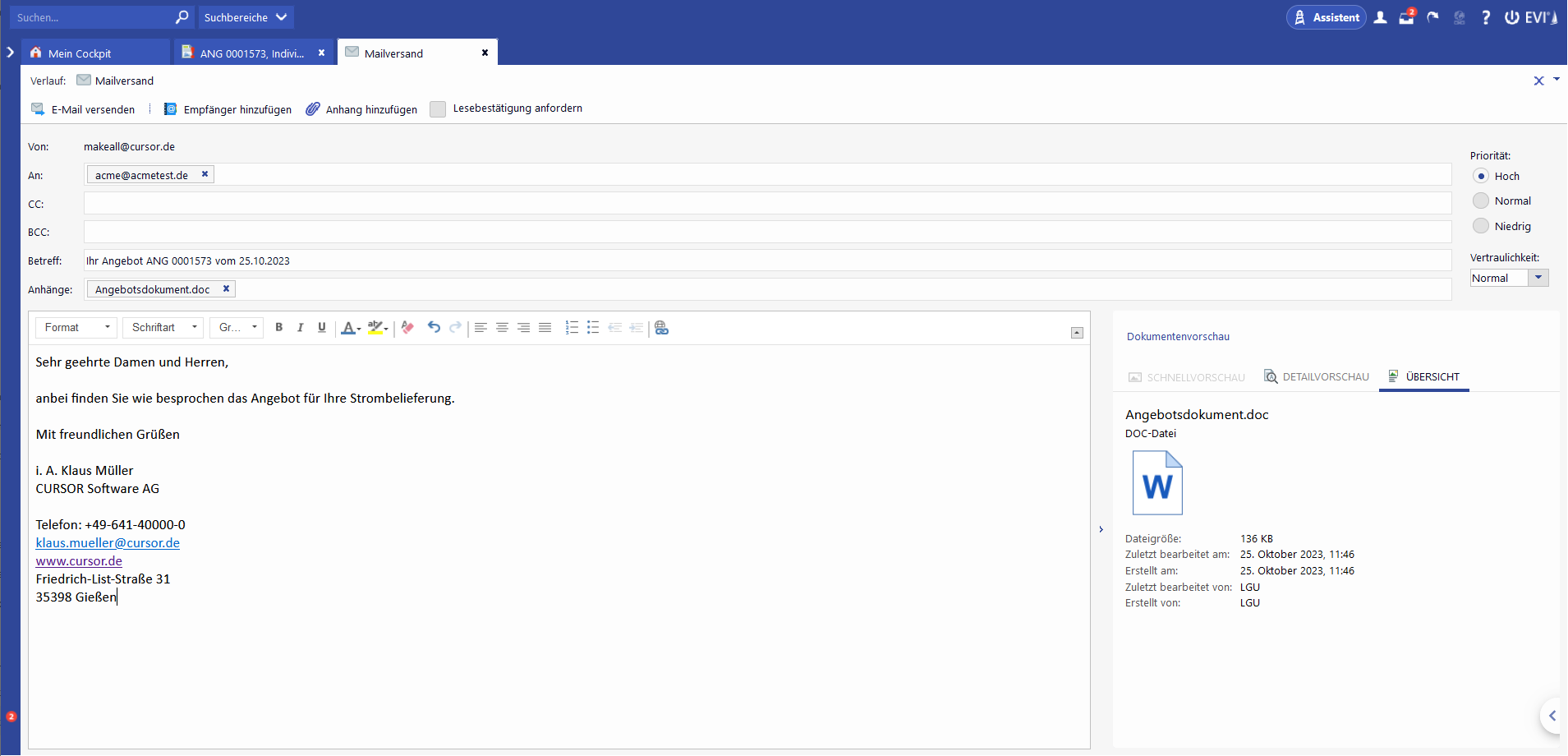 Um das Angebot per Mail an den Geschäftspartner zu versenden steht der Schalter Angebot per Mail versenden in der Aktionsbox zum Angebot zur Verfügung.