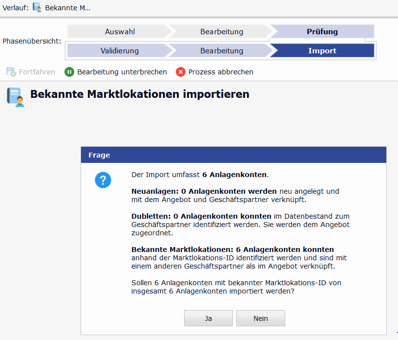Ja: Sollen die Anlagenkonten dennoch angelegt werden kann der Prozess durch Bestätigung der Meldung mit "Ja" fortgesetzt werden. Der Prozess endet auf dem Angebot und die zu importierenden Anlagenkonten mit der bekannten Marktlokation sind unter dem neuen Geschäftspartner neu angelegt und mit dem Angebot verknüpft.