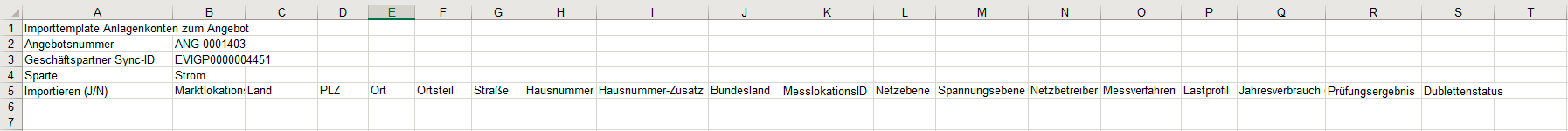 Diese Datei weist ein bestimmtes Format auf, welches nicht manuell angepasst werden kann. Sollte der Anwender grundlegende Änderungen vornehmen, so kann die Datei nicht mehr in die Anwendung zurückgeführt werden. Die Spaltenüberschriften, sowie der Informationsbereich Angebotsnummer, Geschäftspartnernummer und Sparte werden jeweils beim Aufruf der Datei über den Prozess erneut überschrieben, um die Korrektheit der Importstruktur zu gewährleisten