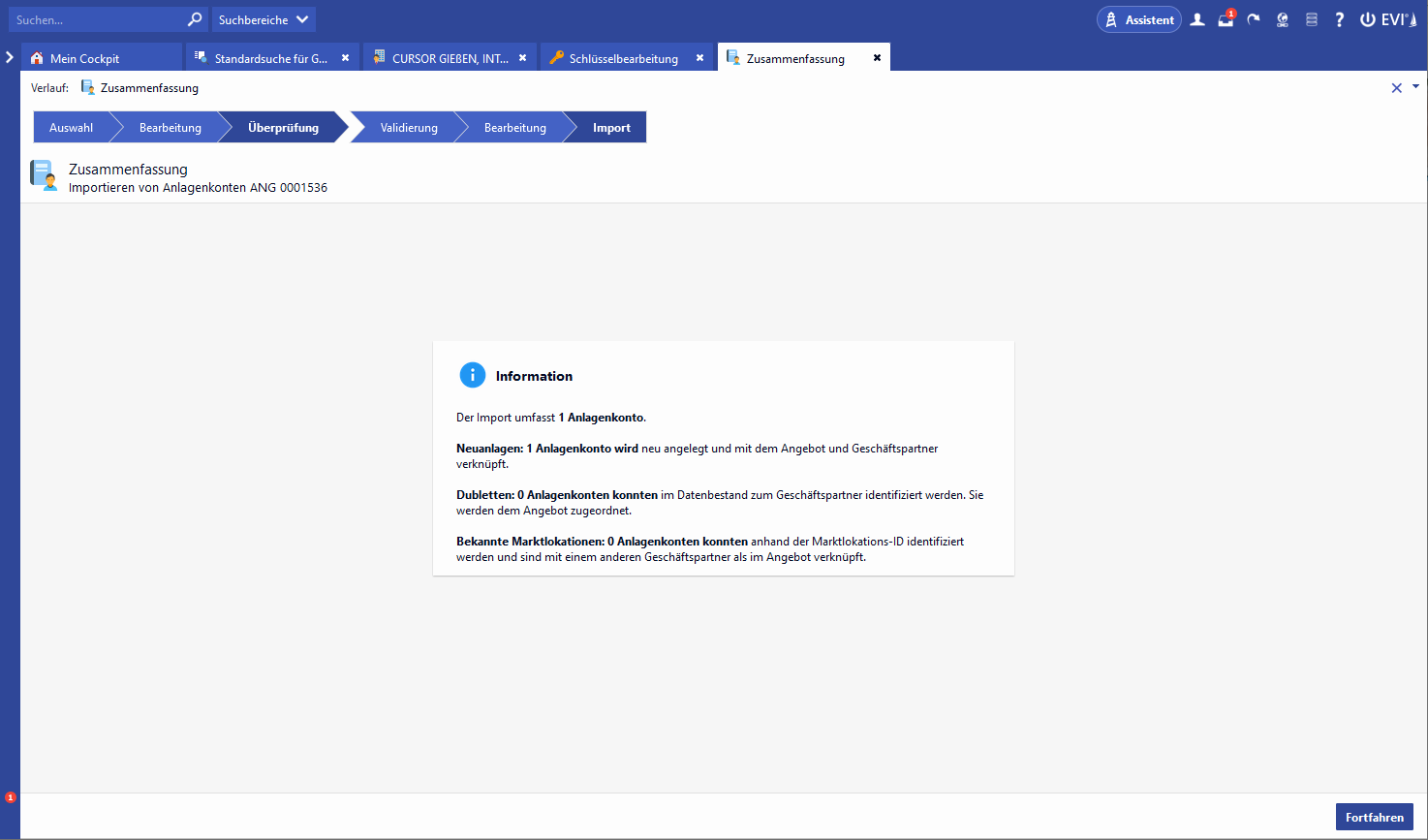 Auch ist es möglich die Excel-Datei direkt über den Prozess an den Kunden zu versenden. Vor dem Import der Anlagenkonten wird eine Konsistenz-, sowie Dublettenprüfung gegen den EVI-Datenbestand durchgeführt.