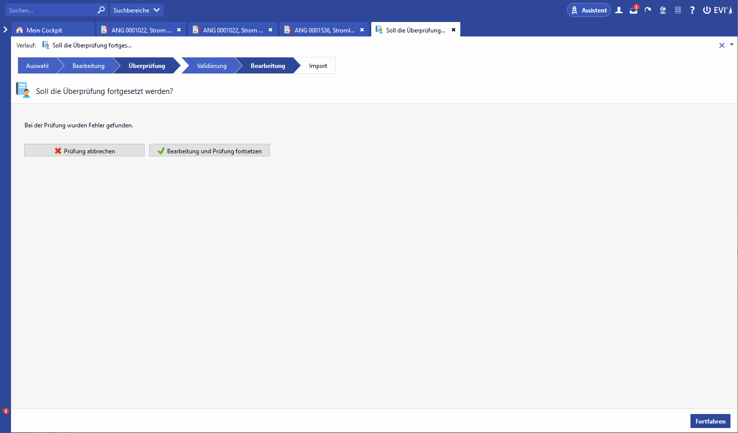 Wurde im Rahmen der Überprüfung ein Fehler festgestellt wird der Anwender darauf hingewiesen und kann die Prüfung beenden oder die Importdatei erneut öffnen, um die Prüfung fortzusetzen. Der festgestellte Fehler wird in der Spalte R "Prüfungsergebnis" näher beschrieben.