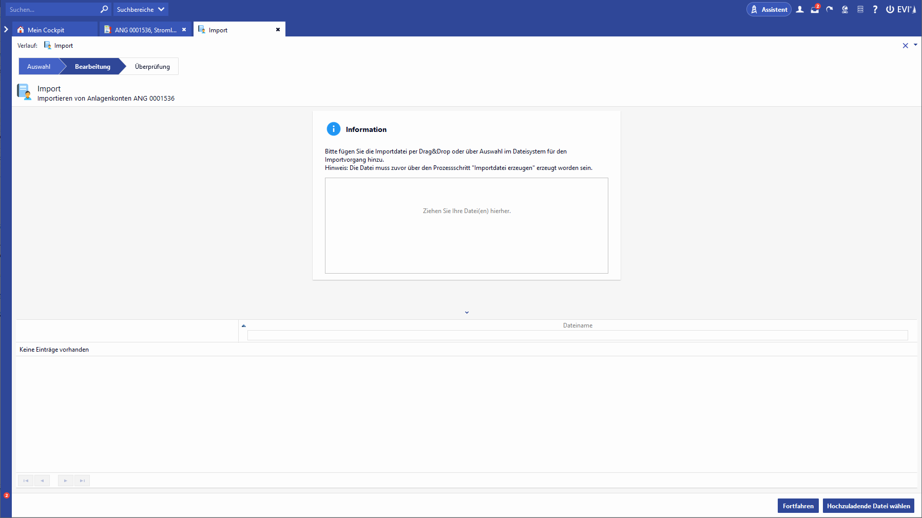 Voraussetzung für den Import einer Anlagenkonten-Liste ist, dass die Importdatei über den zuvor beschriebenen Prozess zum Angebot erzeugt und versendet wurde. Nach der Auswahl des Schalters "Importdatei importieren" öffnet sich eine Prozessmaske in der der Anwender eine bereits vorhandene Importdatei hochladen kann. Diese kann entweder durch Drag&Drop in die Maske gezogen werden oder über den Schalter "Hochzuladende Datei wählen..." erfolgen. Nach Fortsetzen dieses Schrittes erfolgt der Import.