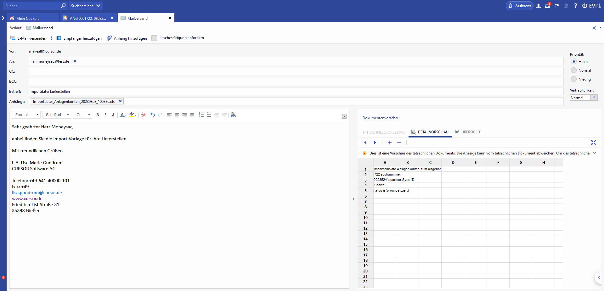 Wurde eine Importdatei erstellt, so kann diese per Mail versendet werden. Nach Auswahl der Option "Importdatei versenden" öffnet sich der E-Mail-Dialog, der mit dem Ansprechpartner aus dem Angebot als Empfänger vorbelegt ist. Die Importdatei ist als Anhang beigefügt.