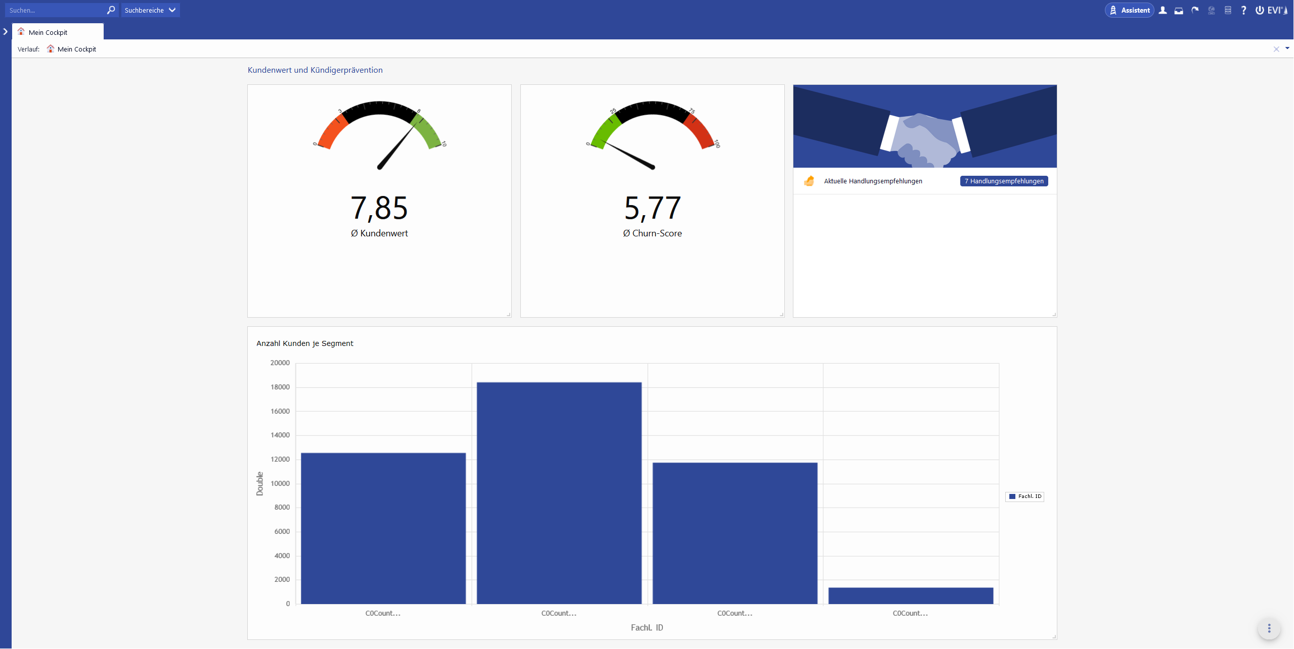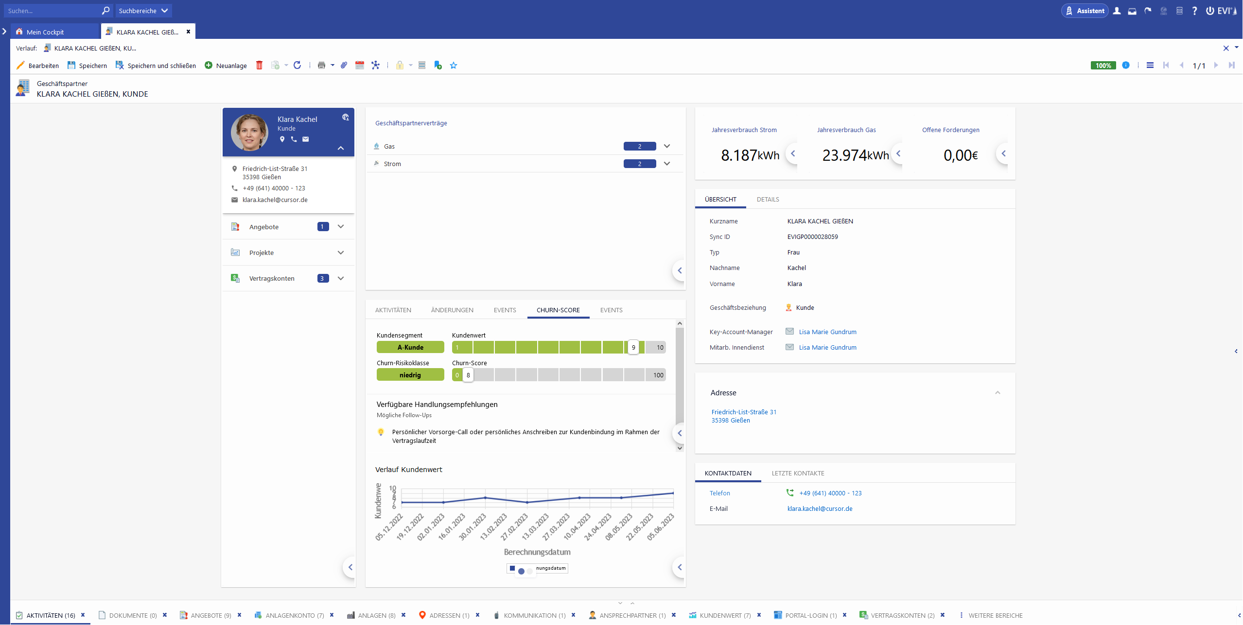 Die von der EfL KI-Analytik aufbereiteten Daten werden in Form einer Importdatei bereitgestellt und zyklisch in EVI importiert. Nach erfolgreichem Import der Daten werden Informationen zum Kundensegment und Kundenwert, der Churn-Risikoklasse sowie der Churn-Score auf den Geschäftspartnern visualisiert. Passende Handlungsempfehlungen werden angeboten.