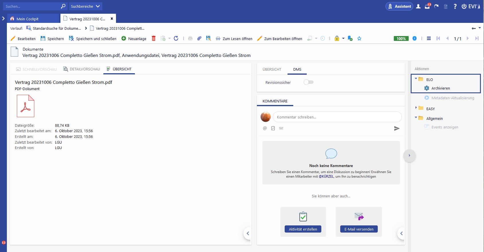 In der Aktionsbox der Dokumentenmaske befindet sich im Ordner "ELO" der Schalter "Archivieren", über welchen die Archivierung gestartet werden kann.