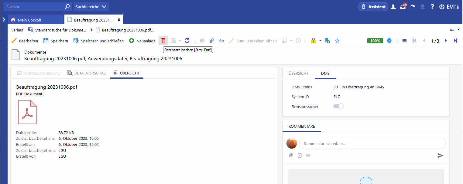 Das EVI-ELO Modul bietet außerdem auch die Möglichkeit, Dokumente zu löschen.