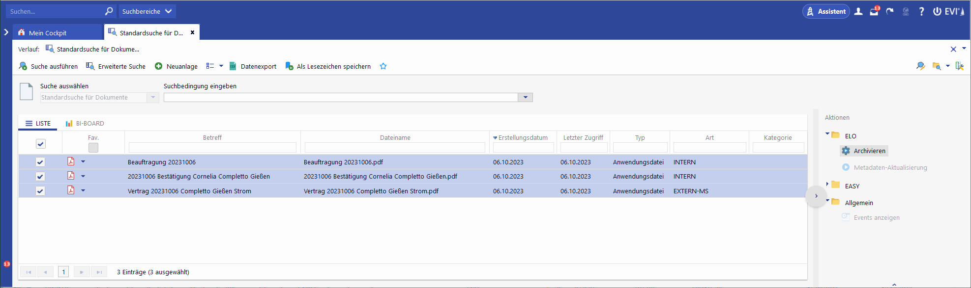 Mittels Zeilenselektoren oder per Markierung der Datensätze mit gedrückter Strg-Taste können in der Listenansicht der Dokumente mehrere Dokumente gleichzeitig zur Archivierung ausgewählt werden.