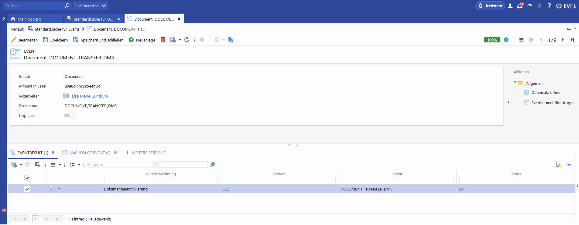 Im Hintergrund wurde für das Dokument ein Event "DOCUMENT_TRANSFER_DMS" geschrieben. Dieses kann über den Aktionsboxschalter "Events anzeigen" geöffnet werden.