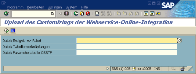 Die Zuordnung zwischen Ereignissen und Paketen (Tabelle /SEB/OSSTEVENTPK) sowie die Auswahl und Verknüpfung der Tabellen in den einzelnen Paketren (Tabelle /SEB/OSSTVERKNPF) müssen als tabulatorgetrennte Textdatei (z.B. mit Excel erstellt) vorliegen und werden mit dem Report /SEB/OSST_CUSTOMIZING_UPLOAD (Transaktion /SEB/OSST_CUSTOM_IMP) hochgeladen. Dieser macht zahlreiche Prüfungen, kann jedoch nicht garantieren, dass die WSI auch fehlerfrei funktioniert. Außerdem dient dieser Report auch dazu, die Parametertabelle /SEB/OSSTP hochzuladen, siehe Installationsanleitung.