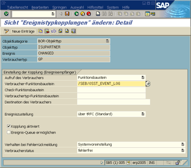 Wenn bei der Verarbeitung eines Ereignisses ein Fehler auftritt, wird ein zweistelliges Kürzel in das Feld ERRORCODE in der Tabelle /SEB/OSST_EVENT geschrieben. Die Tabelle /SEB/OSSTE ist einerseits Werthilfe für dieses Feld, andererseits ist dort auch hinterlegt, ob eine individuelle Beschreibung des Fehlers in die Tabelle /SEB/OSST_ERROR geschrieben wird. Die /SEB/OSSTE hat keine steuernde Wirkung, sondern dient rein der Dokumentation.
