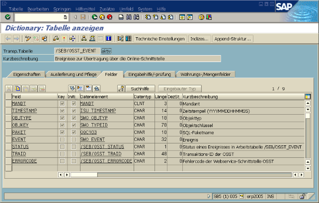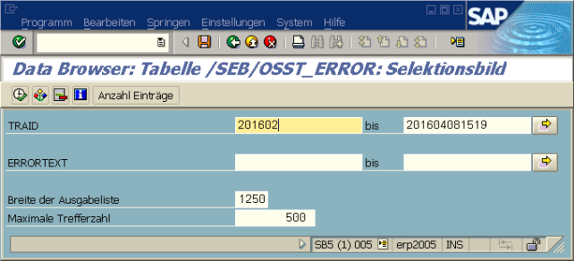 In der Tabelle /SEB/OSST_ERROR wird z.B. die Fehlermeldung des Zielsystems abgelegt oder ein ungültiges SQL-statement infolge eines Fehlers in der Verknüpfungsspezifikation /SEB/OSST_VERKNPF. Der Primärschlüssel der /SEB/OSST_ERROR ist (der Mandant und) die TRAID, so dass für jeden Versuch, ein Ereignis zu übertragen, eine Fehlermeldung gespeichsert werden kann. Außerdem kann wegen des Zeitstempels am Anfang der TRAID auch hier ein Zeitraum selektiert werden.