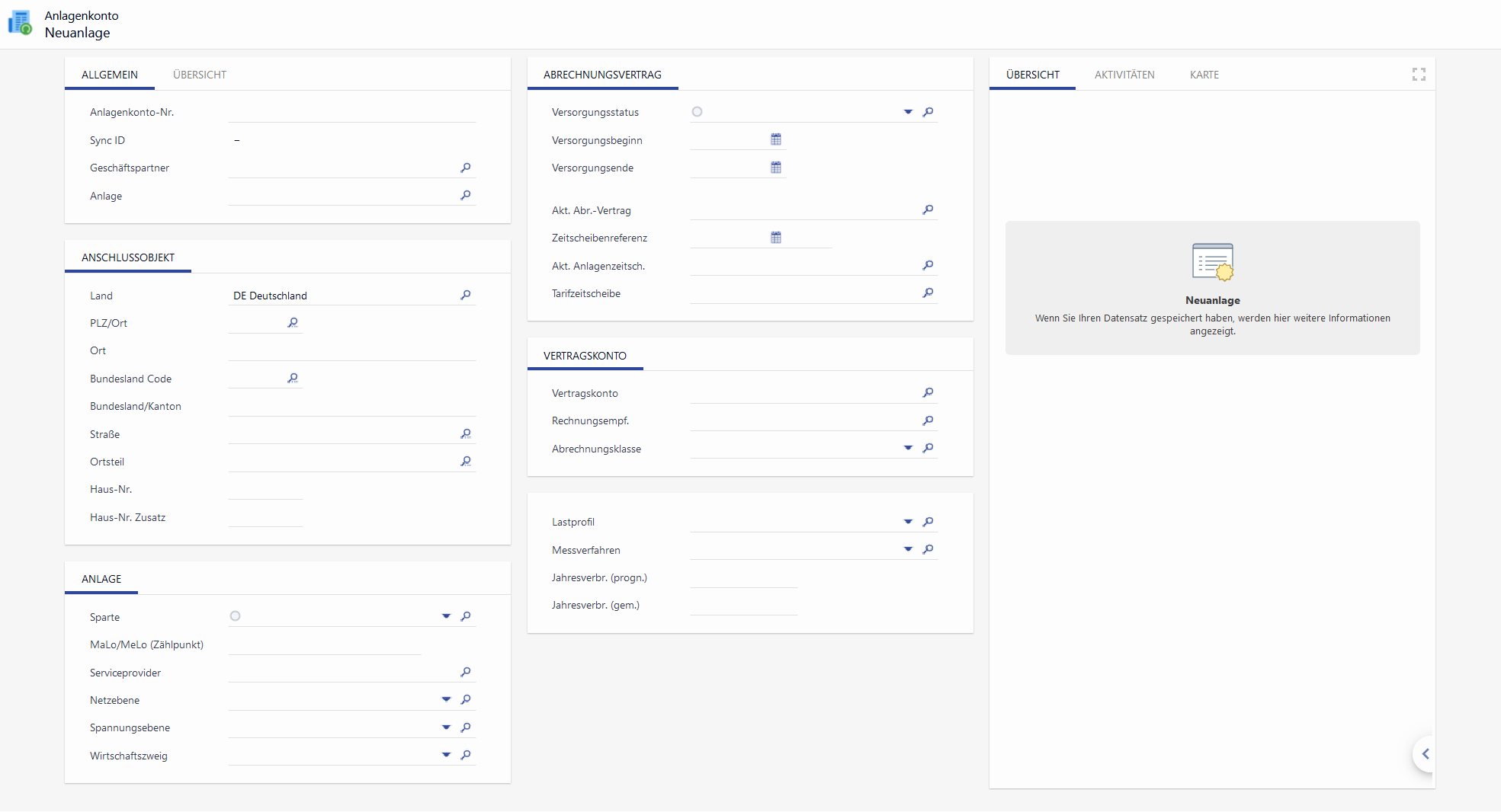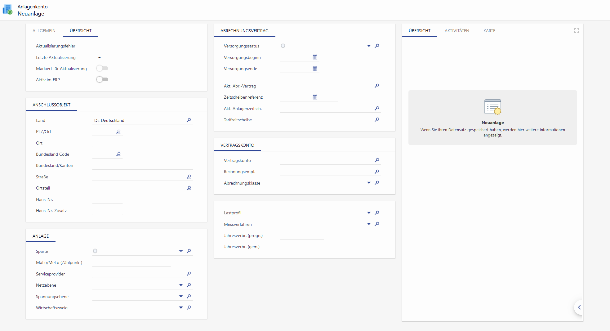 Initial werden vorhandene Verbrauchsstellen aus dem Stammdatenimport aus dem Abrechnungssystem aufgebaut. Spätere Neuanlagen von Interessentenanlagen werden im CRM durchgeführt. Das Anlagenkonto dient dabei als eine Art Schnellerfassungsmaske, auf der alle für den Angebotsprozess relevanten Informationen eingetragen werden.