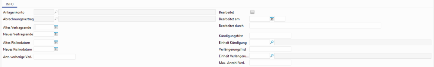 Anlagekonten (Verträge) mit automatischer Verlängerungskondition sollen automatisch verlängert werden. Hierzu gibt es eine gesonderte Entität unter welcher alle relevanten Informationen erfasst werden können. Siehe folgende Darstellung und die folgende Feldliste.