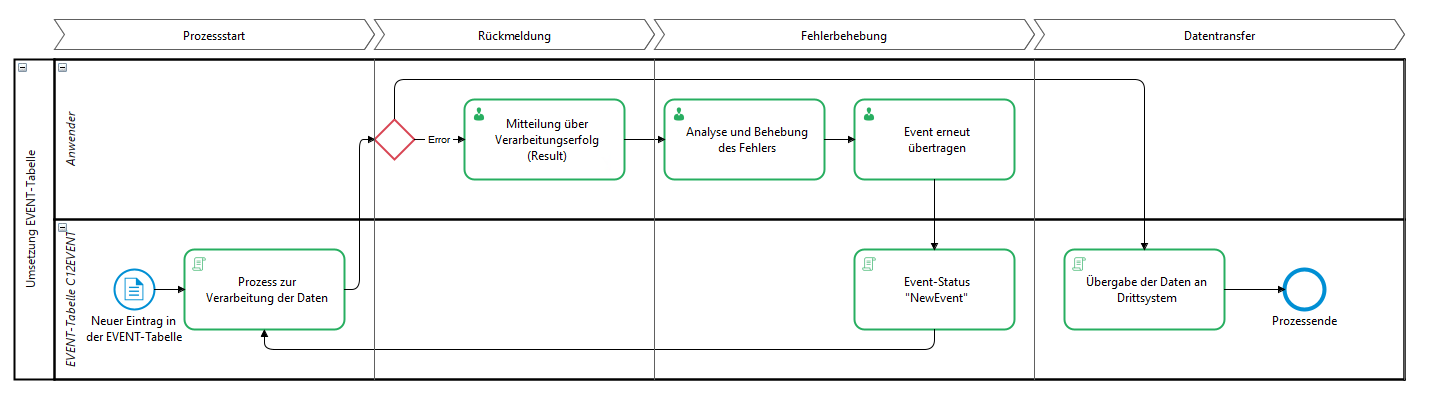 Die Event-Tabelle dient als Transaktionstabelle, auf die weitere BPM-Prozesse oder Schnittstellen reagieren können. Dies kann bspw. bei Neuanlage eines neuen Events oder durch zyklische Prüfung der Event-Tabelle geschehen. Das Überprüfen der Eventtabelle auf neue Einträge ist je Prozess oder Schnittstelle individuell zu behandeln.