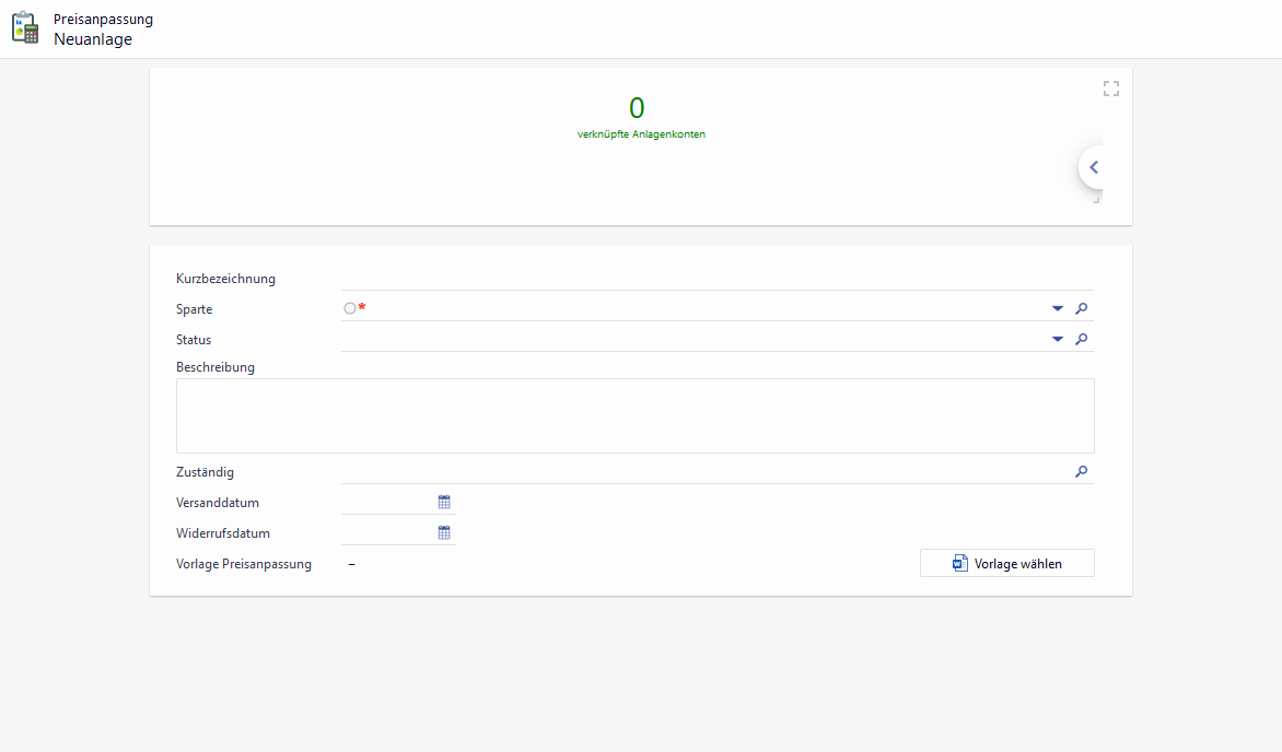 Eine Preisanpassung ist Teil des Tarifmanagements. Die Entität Preisanpassung dient dazu, die Informationen zu einer Preisanpassung innerhalb eines Tarifs an den Kunden vorzubereiten und den Vorgang zu koordinieren. Dafür stehen Felder zur inhaltlichen Beschreibung, wie Kurzbezeichnung, Beschreibung und Sparte zur Verfügung, aber auch Organisationseinheiten, wie bspw. zuständiger Mitarbeiter, Versanddatum und die zu verwendende Word-Vorlage.