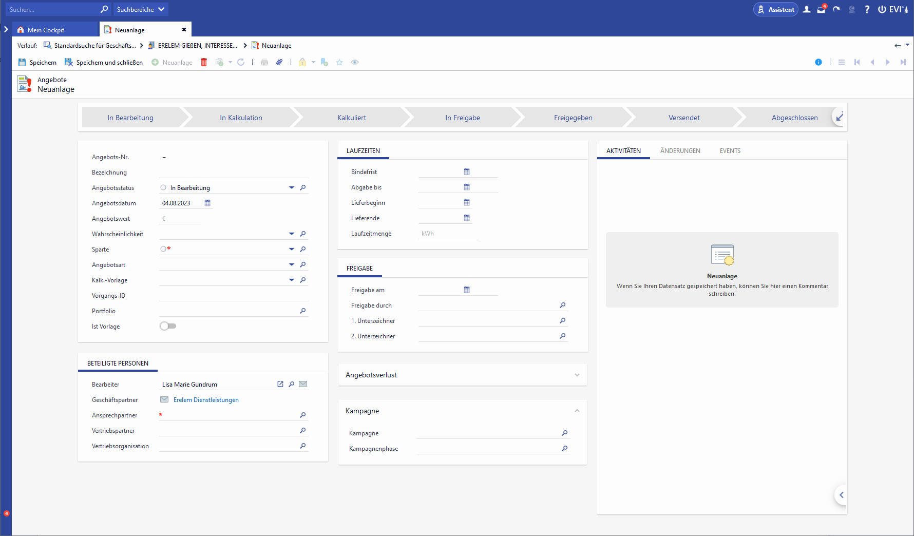 Der Status des Angebotes wird initial auf IN BEARBEITUNG gesetzt.