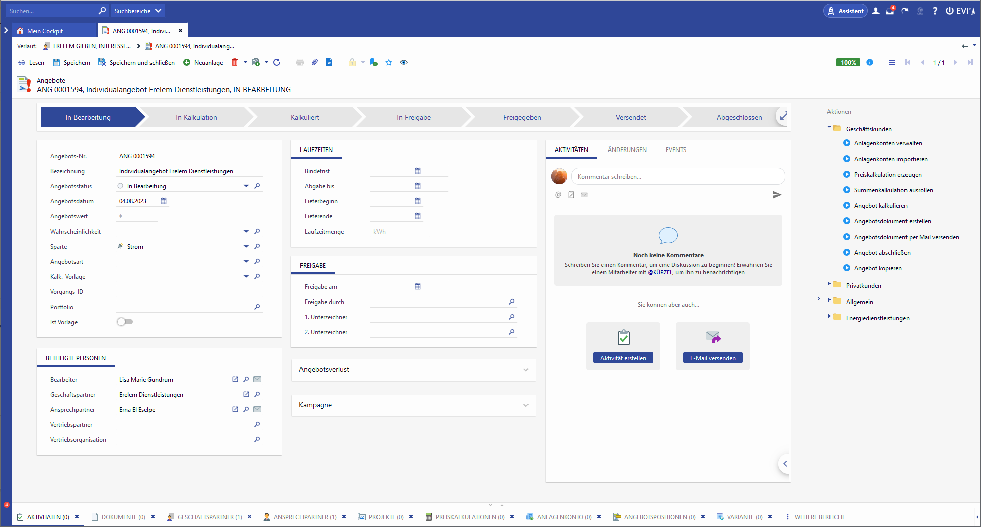 und wird sowohl für Strom- als auch für Gasangebote angewendet. Da der Angebotsprozess viele individuelle Prozessbestandteile besitzt, besteht die Möglichkeit, in jeder Phase des Prozesses weitere Aktionen über die Aktionsbox zu starten oder die Bearbeitung des Prozesses zu pausieren (da bspw. auf Rückmeldung des Geschäftspartners zu warten ist). Über die Statusführung sowie die Aktionsbox können Sie jederzeit erkennen, in welchem Prozessschritt das Angebot steht und welche Aktionen als nächstes ausgeführt werden können.