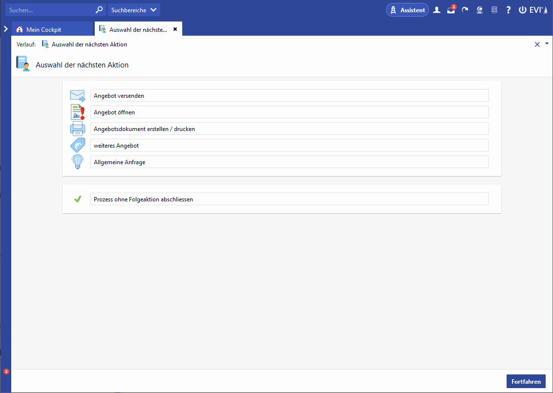 Mit dieser Erweiterung ist es nun möglich, mehrere Folgeaktionen auszuführen. So können Sie beispielsweise nach der Erstellung eines Privatkunden-Angebots das Angebotsdokument erzeugen und direkt, ohne die Prozessführung verlassen zu müssen, ein weiteres Angebot für eine andere Sparte anlegen.
