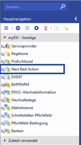 Der Zugang zur Konfiguration der NBA erfolgt über myEVI → Konfiguration → Sonstige → Next Best Action