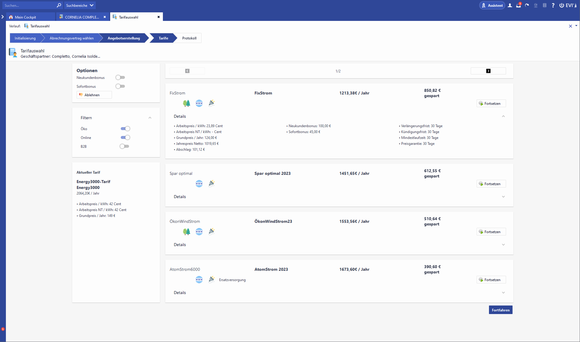 Auf Grundlage der Sparte des Anlagenkontos, dem Serviceprovider und dem Jahresverbrauch werden nun analog dem Angebotsprozess passende Tarife ermittelt und angezeigt. In der Tarifübersicht sehen Sie die Ersparnis jedes verfügbaren Tarifs im Vergleich zum aktuellen Tarif, der auf der linken Seite ausgewiesen wird.
