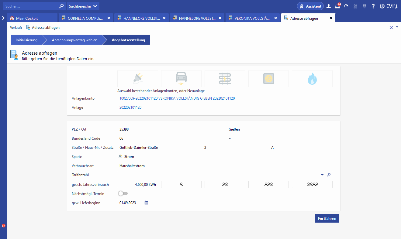 In diesem Schritt wird das identifizierte Anlagenkonto über den Abrechnungsvertrag automatisch übernommen. Der Jahresverbrauch wird aus dem gleichnamigen Feld aus dem Anlagenkonto ermittelt.