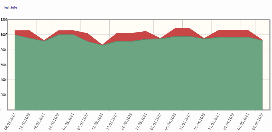 Das Diagramm wird aus der Entität Testläufe (ScriptTestRun) gespeist. Werden an einem Tag die Testläufe mehrfach ausgeführt, so werden diese aufsummiert. Ein Klick in das Diagramm öffnet die Testläufe in der Listenansicht.