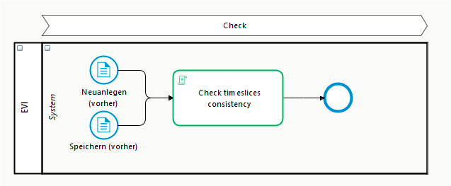 Die Prüfung zur Laufzeit (Neuanlage und Änderung) erfolgt über einen generischen BPM-Prozess. Dieser nutzt die Methoden aus der Skriptbibliothek zur Prüfung auf eventuell vorliegende Zeitscheibenkonflikte und gibt in diesem Fall einen Fehler (technisch: Exception) aus.