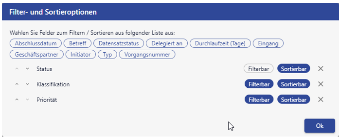Die Filter- und Sortier-Komponente, die bspw. in der Kanban- oder CompactList-Kachel verwendet wird, wurde überarbeitet und verbessert.
