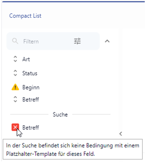 Sind Felder in der Filter- und Sortierkomponente vorhanden, die in der hinterlegten Suche der Kachel nicht vorhanden sind, so werden diese Felder mit einem optischen Hinweis ausgestattet.