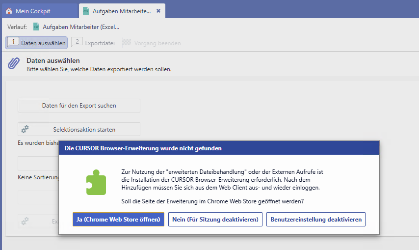 Wenn die erweiterte Dateibehandlung per Benutzereinstellung deaktiviert ist, erscheint der Dialog zur erweiterten Dateibehandlung erst gar nicht. Stattdessen wird die Excel-Datei analog zum Excel-Export von Suchergebnislisten direkt heruntergeladen.