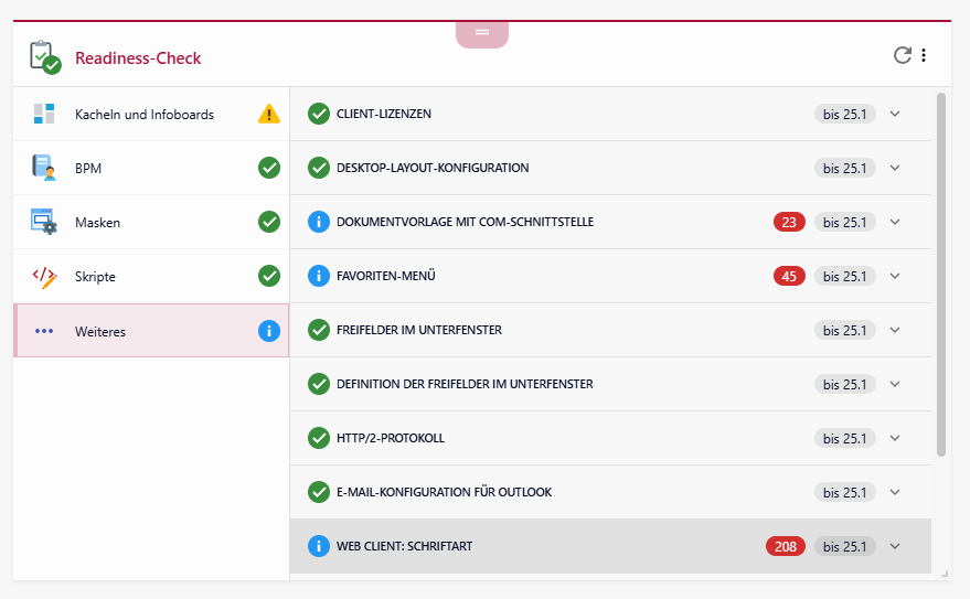 Die Kachel Readiness Check wurde um eine Information ergänzt, wie viele Readiness-Warnungen bzw. -Fehler im System vorhanden sind.