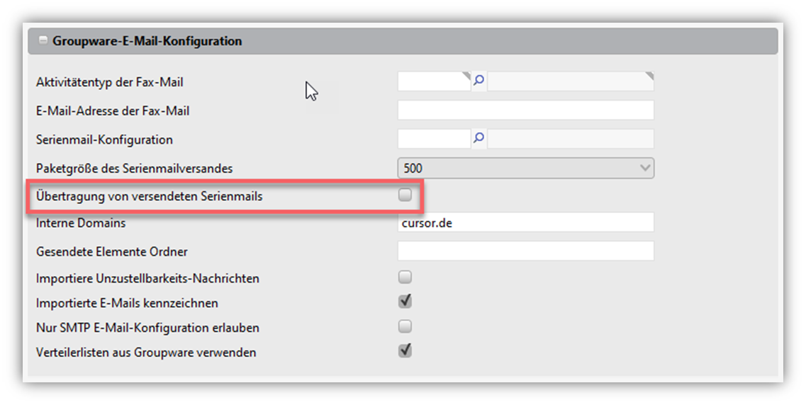 Übertragung versendeter Serienmails in den "Gesendete Elemente"-Ordner in Outlook war aus Performance-Gründen bisher nicht möglich. Diese Möglichkeit wurde jetzt geschaffen, indem eine Systemeinstellung (unter der Groupware-Konfiguration) eingeführt wurde, welche die Übertragung nach Outlook steuert. Mit der Aktivierung der Systemeinstellung "Übertragung von versendeten Serienmails" wird dies beim Versand der Serienmails durchgeführt. Der Default dieser Systemeinstellung ist false.