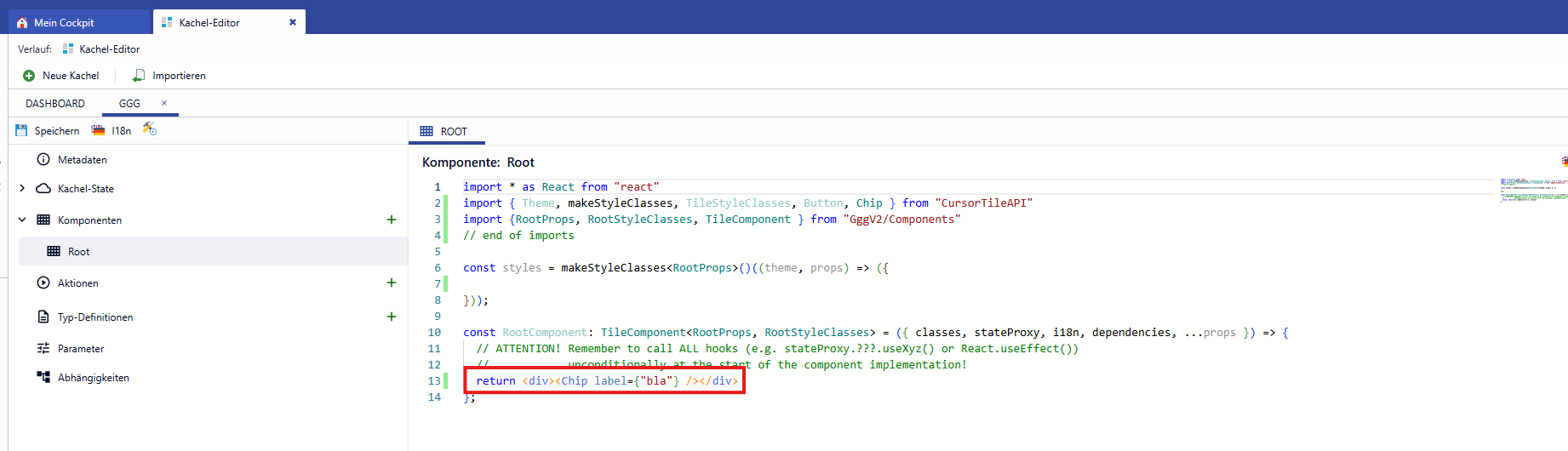 Bisher war die Chip-Komponente zwar im Storybook dokumentiert, ließ sich aber nicht im Editor importieren. Jetzt ist eine Bearbeitung der Komponente im Kachel-Editor möglich.