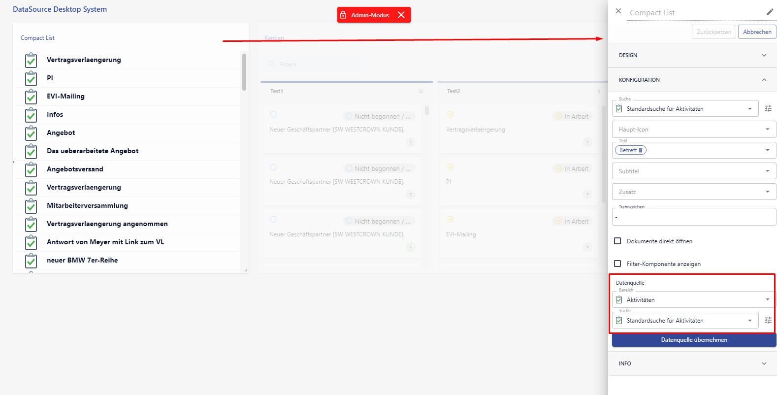Um Features wie die explizite Suchausführung zur Performanceverbesserung zu ermöglichen, wurde der Datenquelle-Editor in die CompactList-Kachel mit aufgenommen.