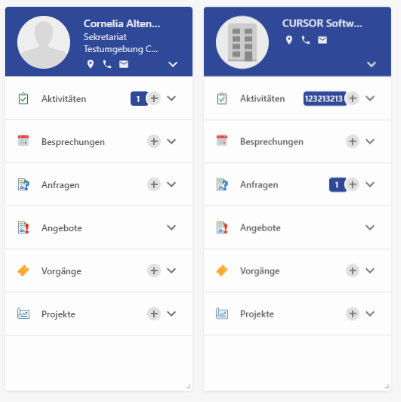 Mithilfe der Kacheln Ansprech- und Geschäftspartner-Porträt ist es nun möglich, Neuanlagen via einem Plus-Button neben der Badge-Anzeige durchzuführen. Die Neuanlagen verhalten sich genau so, wie sie zustande kommen würden, wenn die Neuanlage über den Unterbereich getätigt wird, somit werden auch sämtliche Vorbelegungen von Feldern durchgeführt.