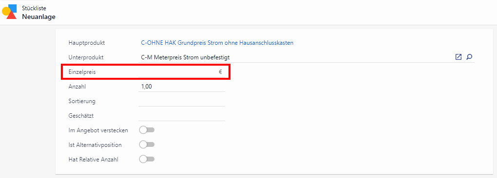 Abbildung: Das Feld 'Einzelpreis' in der Stückliste