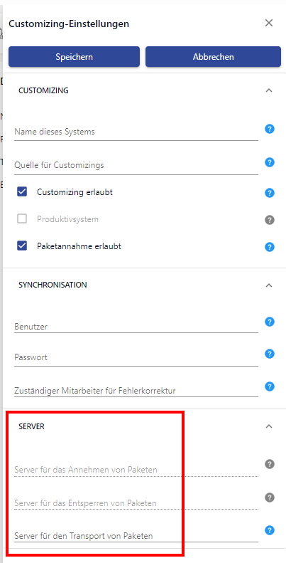 Die Einstellungen für den Customizing-Transport im Web besitzen für die unterschiedlichen Server zur Annahme, zum Entsperren und dem Transport von Customizing-Paketen nur noch die Überschrift "SERVER" anstatt "WSDL-ADRESSEN PFLEGEN".