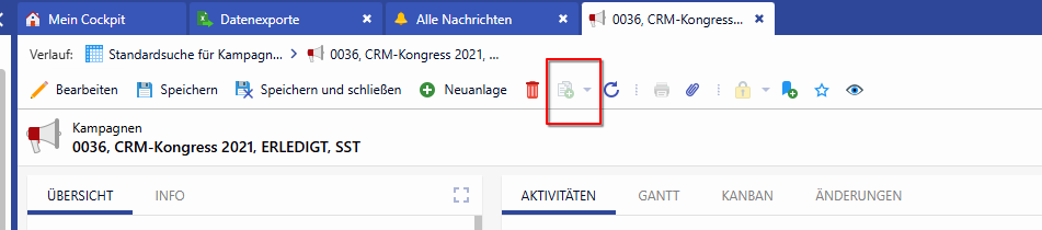 In der Detailansicht einer Kampagne stand bisher in der Toolbar der Schalter zum Kopieren des Datensatzes zur Verfügung. Kopierte man eine Kampagne auf diesem Weg, wurde die ID der Kampagne 1:1 kopiert - diese sollte allerdings eindeutig sein. Da zum Kopieren einer Kampagne inklusive der zugehörigen Daten wie Kampagnenphasen, Outbounds, Aktivitäten zur Verfügung stehen, wurde der Schalter zum Kopieren des einzelnen Datensatzes deaktiviert, sowohl für die parallele als auch die serielle Logik zur Kampagnenbearbeitung.