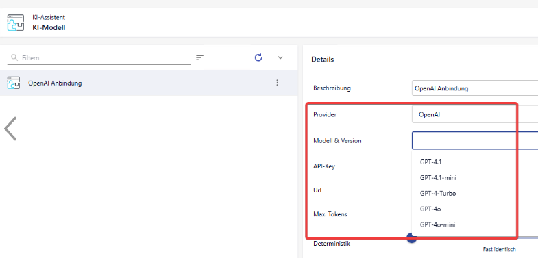 Im CURSOR CRM kann auch eine Schnittstelle zu OpenAI und den KI-Modellen GPT-4 verwendet werden. In dem KI-Assistent können nun in dem Bereich KI-Modell folgende Modelle ausgewählt werden: