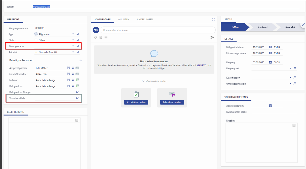 Es wurden die beiden Felder “Verantwortlich” und “Lösungsstatus” auf der Standard-Vorgangsmaske platziert.
