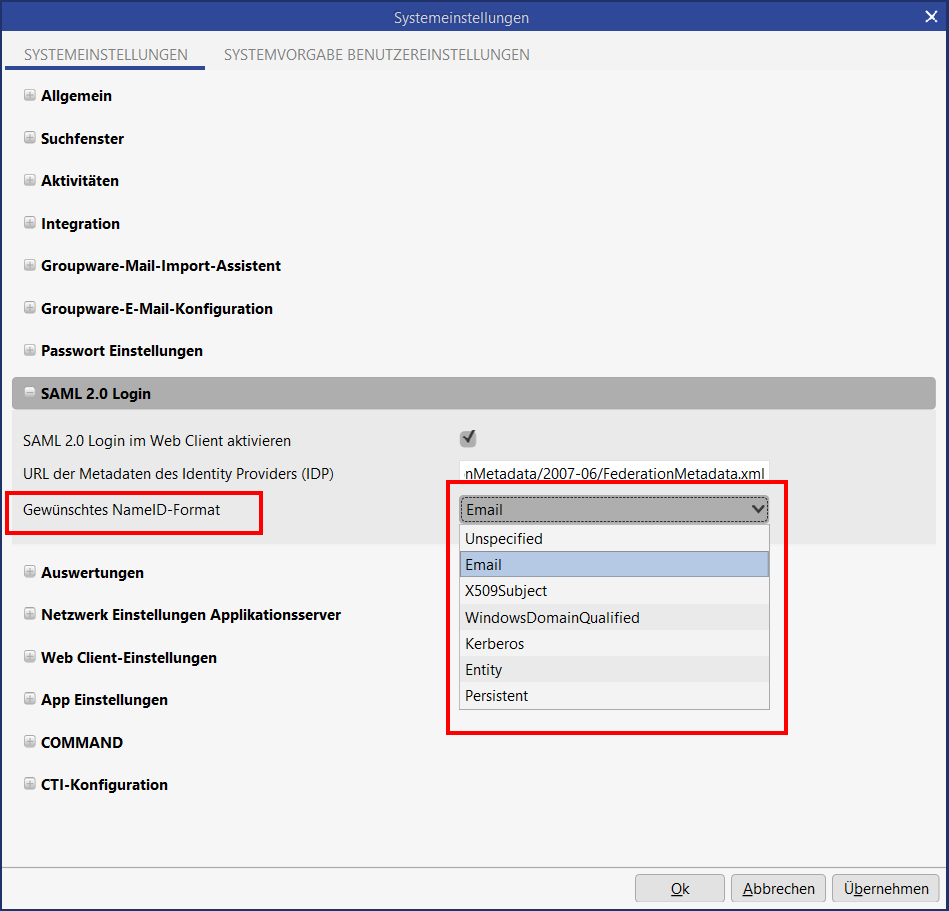 In den Systemeinstellungen ist die Option "Gewünschtes NameID-Format" dazu gekommen: