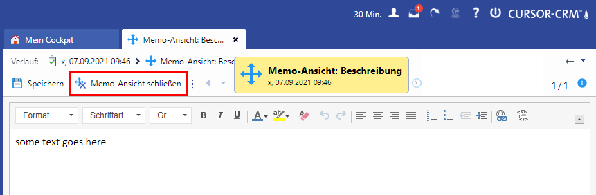 Jetzt wird bei Doppelklick im Beschreibungs-Feld die Memo-Ansicht nicht geöffnet. Die Ansicht wird nur noch durch Aktivierung/Klicken des dafür vorgesehenen Buttons im Beschreibungsfeld geöffnet. Die neue Umsetzung funktioniert sowohl im HTML-Editor als auch in einfachen Memo-Feldern (Textarea). Im Tooltip der Memo-Ansicht kann man jetzt die Beschreibung der zugehörigen Entität ablesen. Außerdem hat der Schließen-Button in der Toolbar jetzt eine Beschriftung.